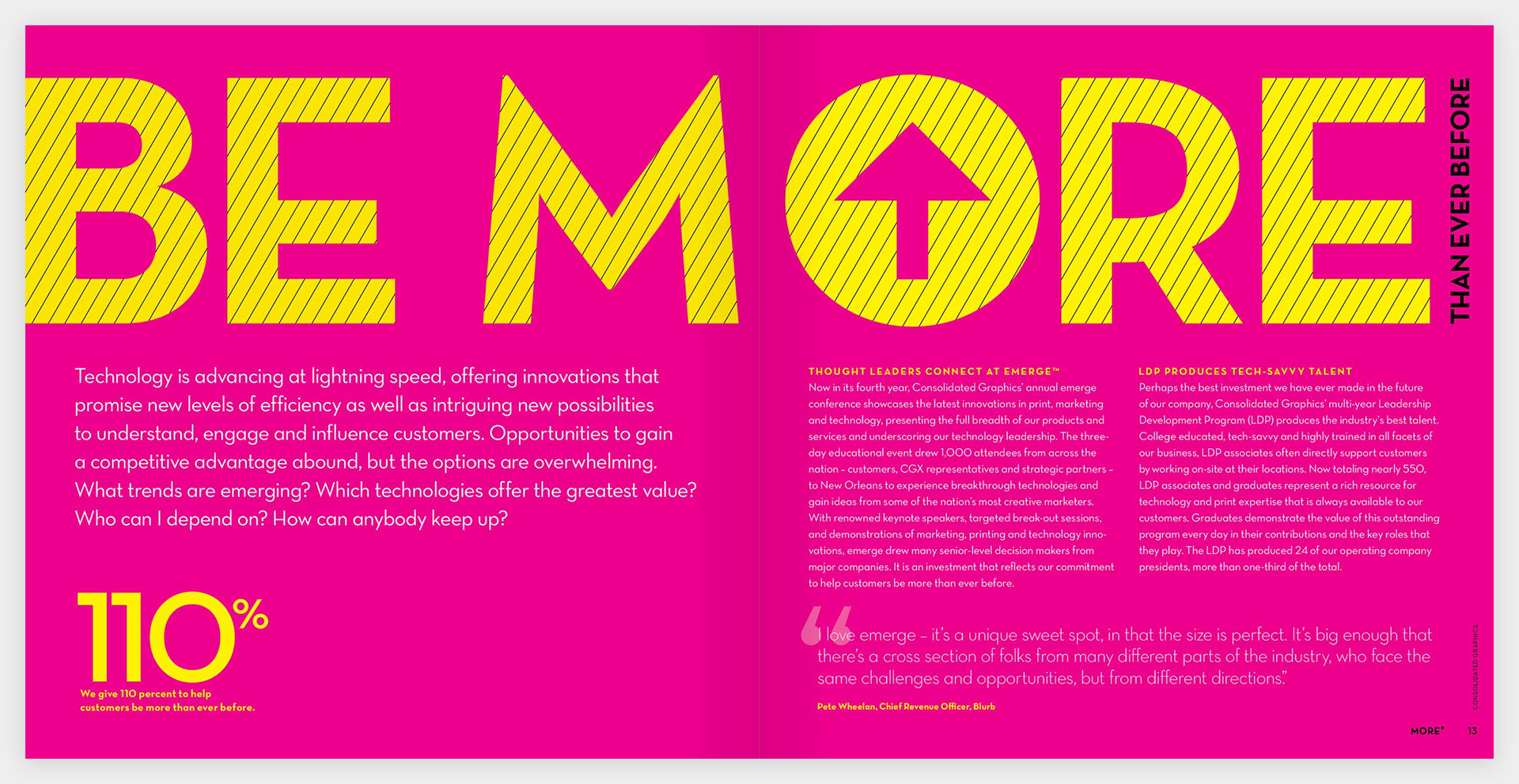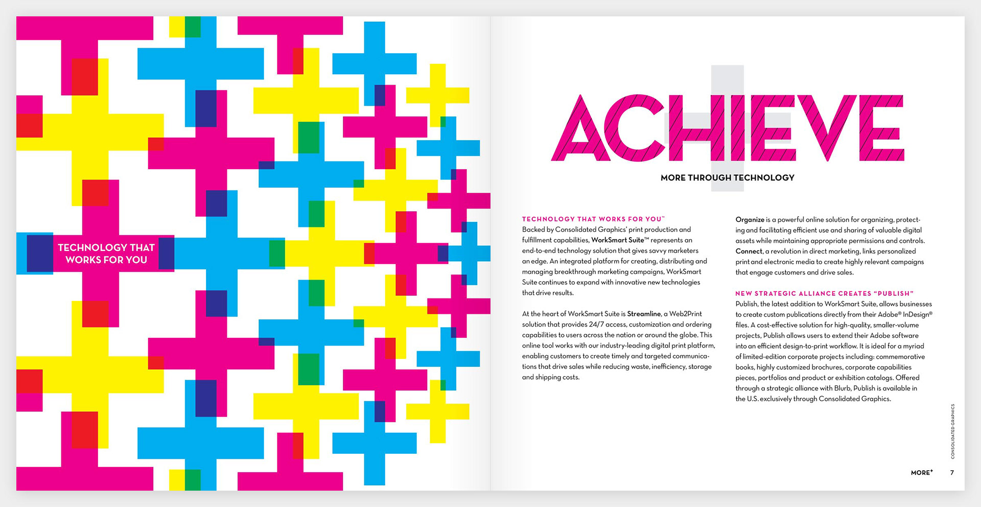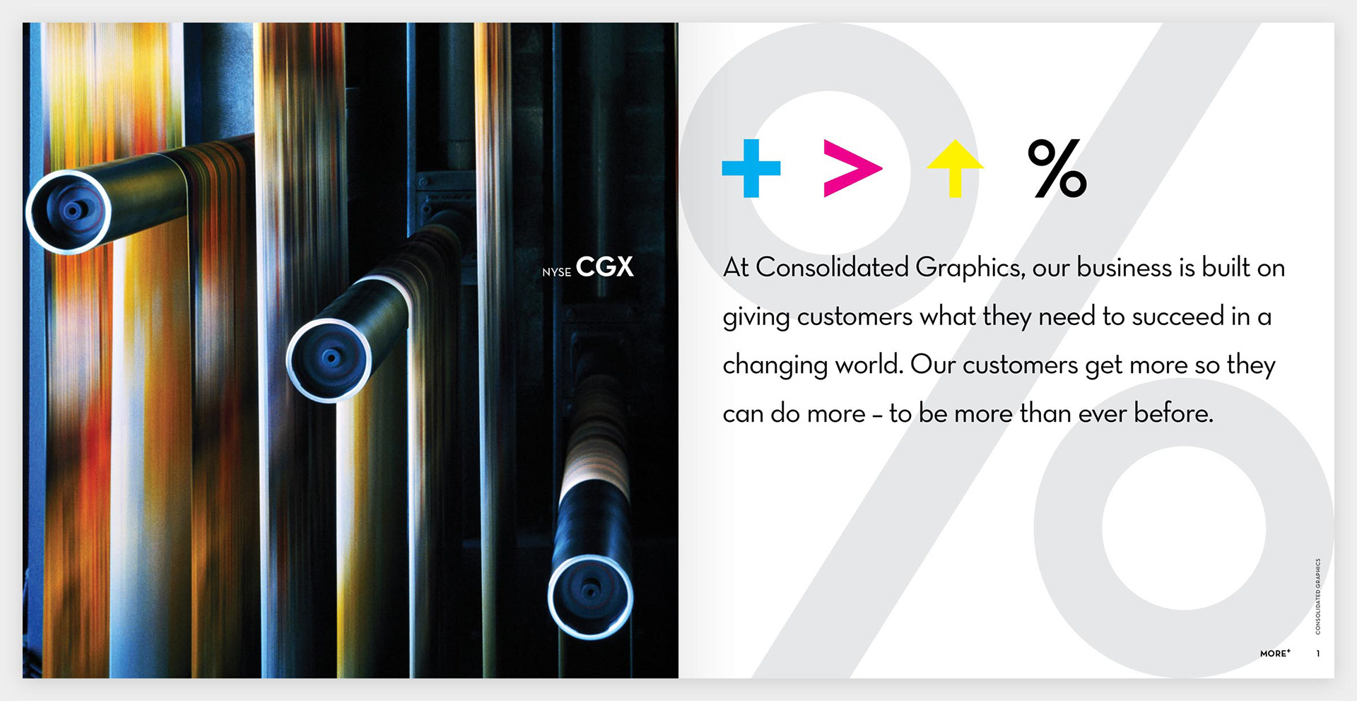 CGX's annual report showcases its strategic and technological leadership in digital printing, particularly in digital communications. This focus is reinforced by the simple yet powerful message: "Get more. Do more. Be more." and through the design with bold symbolism and graphics in CMYK printing colors.