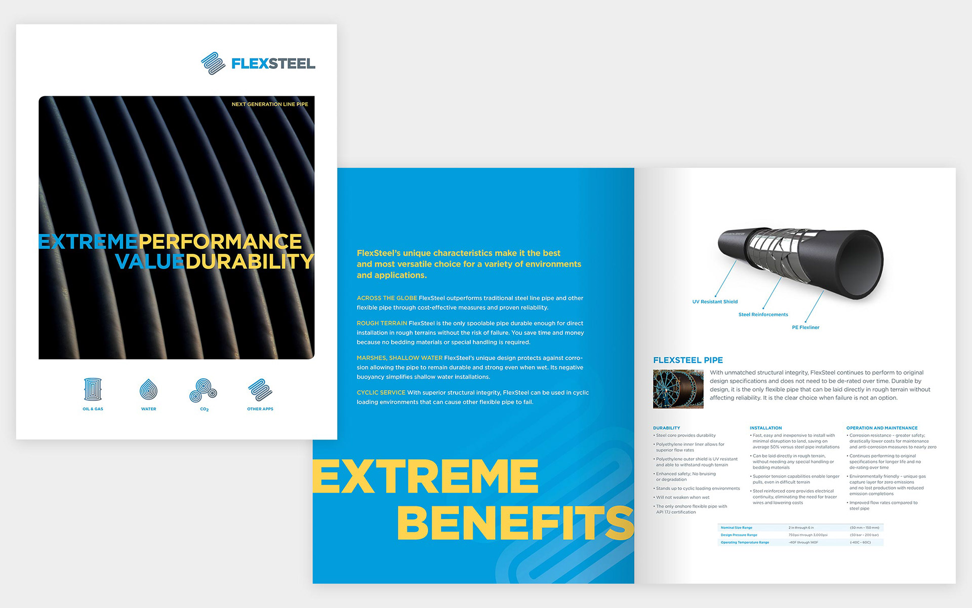 A comprehensive rebrand system for FlexSteel – building awareness and driving adoption of its next-generation line pipe solutions within target industries where its application is not yet fully understood or accepted.