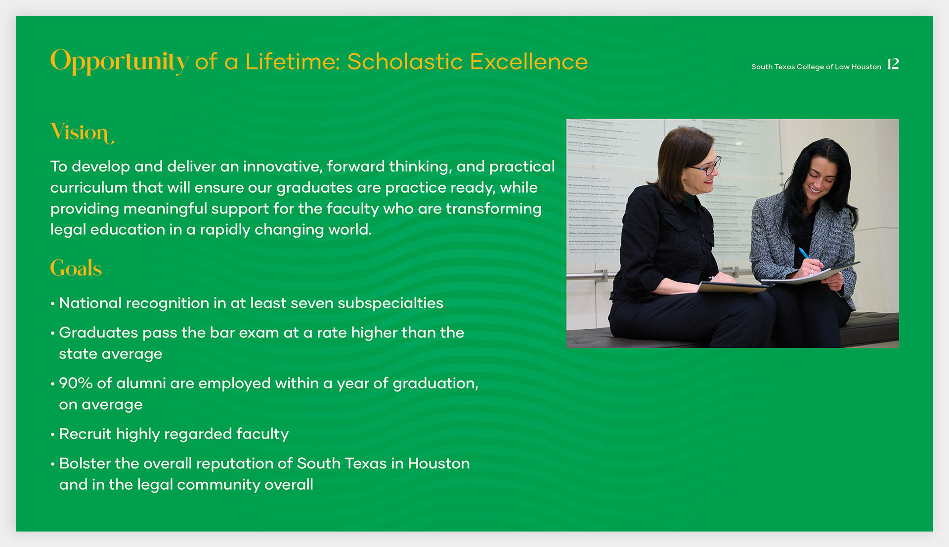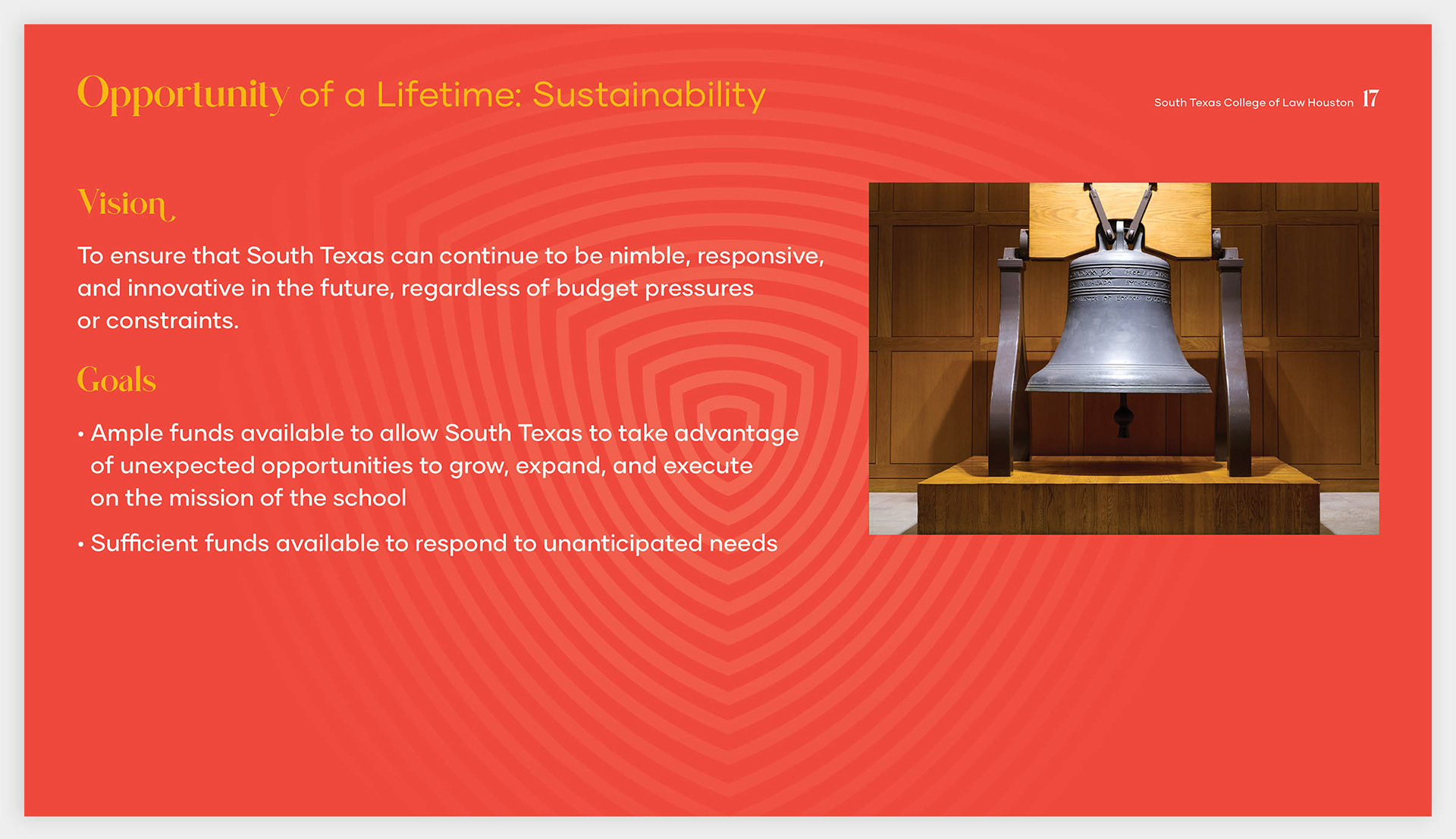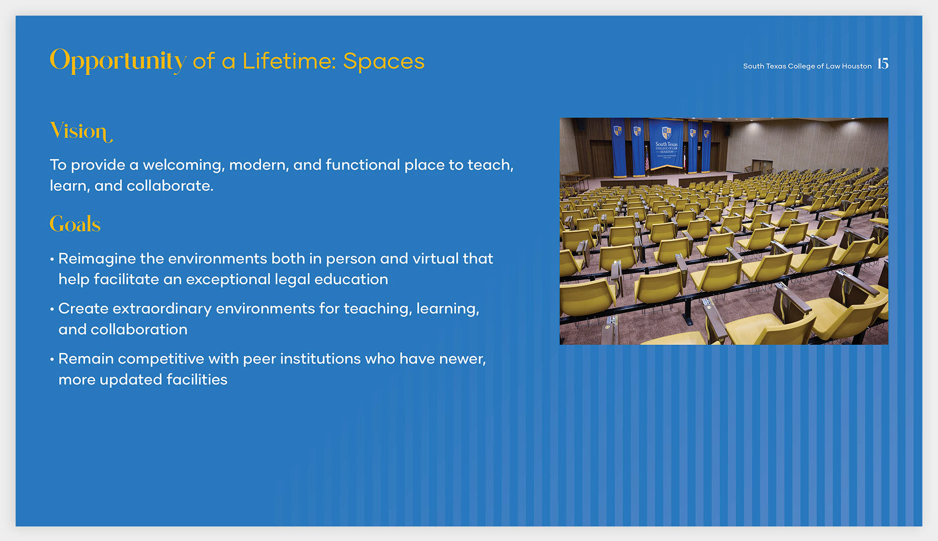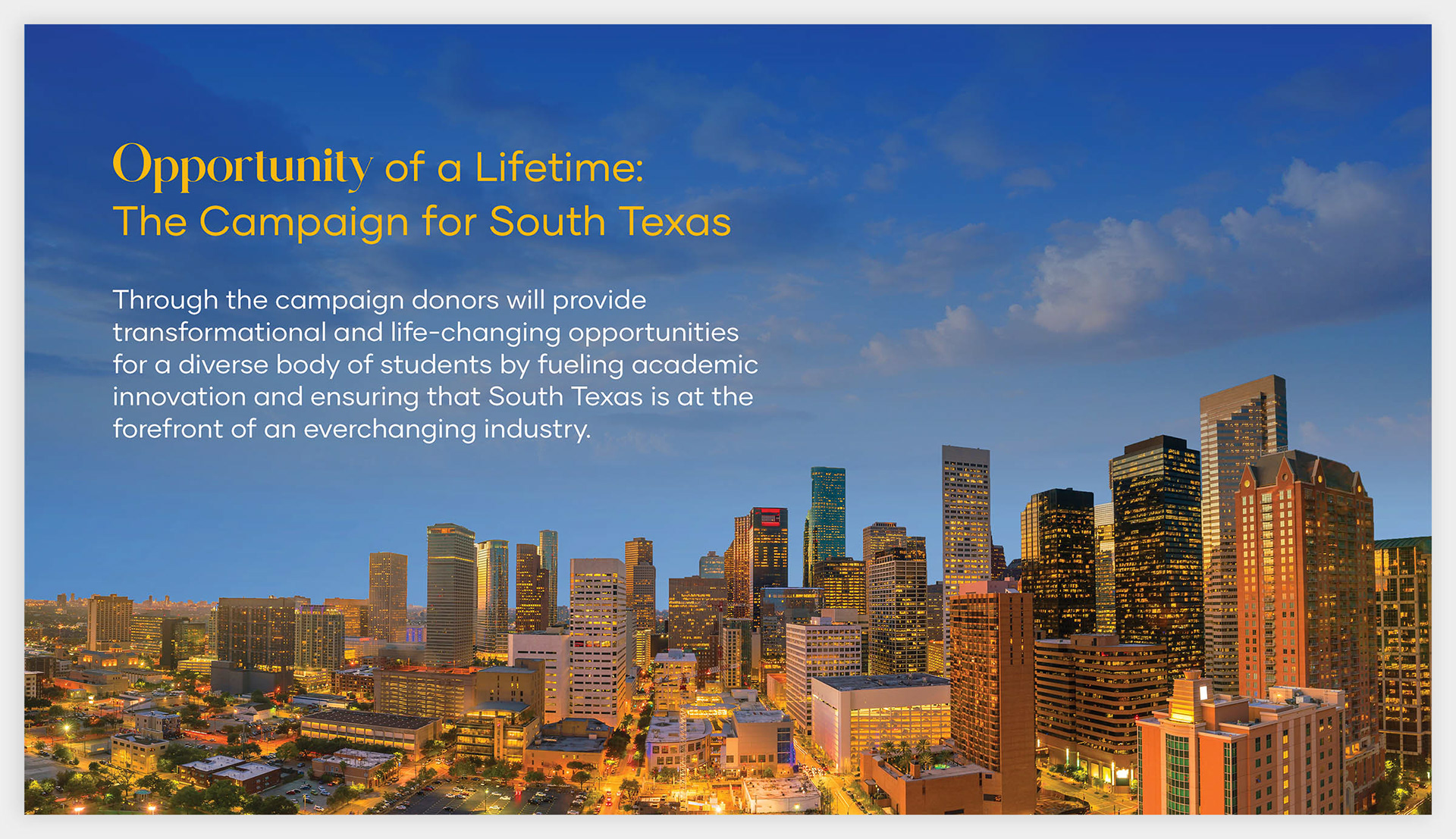 The South Texas College of Law's fund-raising campaign, named "Opportunity of a Lifetime," was created and designed to raise the capital to support student success, develop scholastic excellence, enhance their physical and virtual spaces, and assist in securing the future of practicing law in South Texas.
